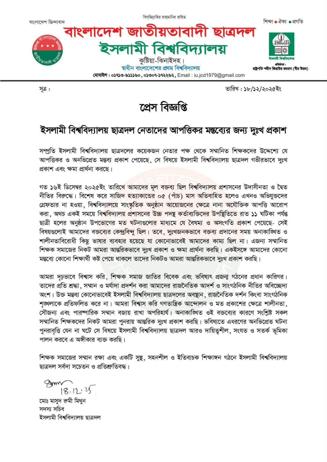 প্রেস বিজ্ঞপ্তিতে বলা হয়, গত ১৬ ডিসেম্বর ইসলামী বিশ্ববিদ্যালয় ছাত্রদলের কয়েকজন নেতা শিক্ষকদের উদ্দেশ্যে যে আপত্তিকর ও অনভিপ্রেত মন্তব্য করেছে সে বিষয়ে ইবি ছাত্রদল গভীরভাবে দুঃখ প্রকাশ এবং ক্ষমা প্রার্থনা করছে।